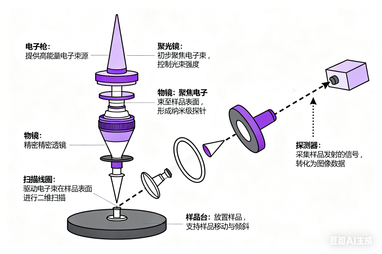 图 2 AI生成的扫描电镜原理示意图 (未验证正确性)