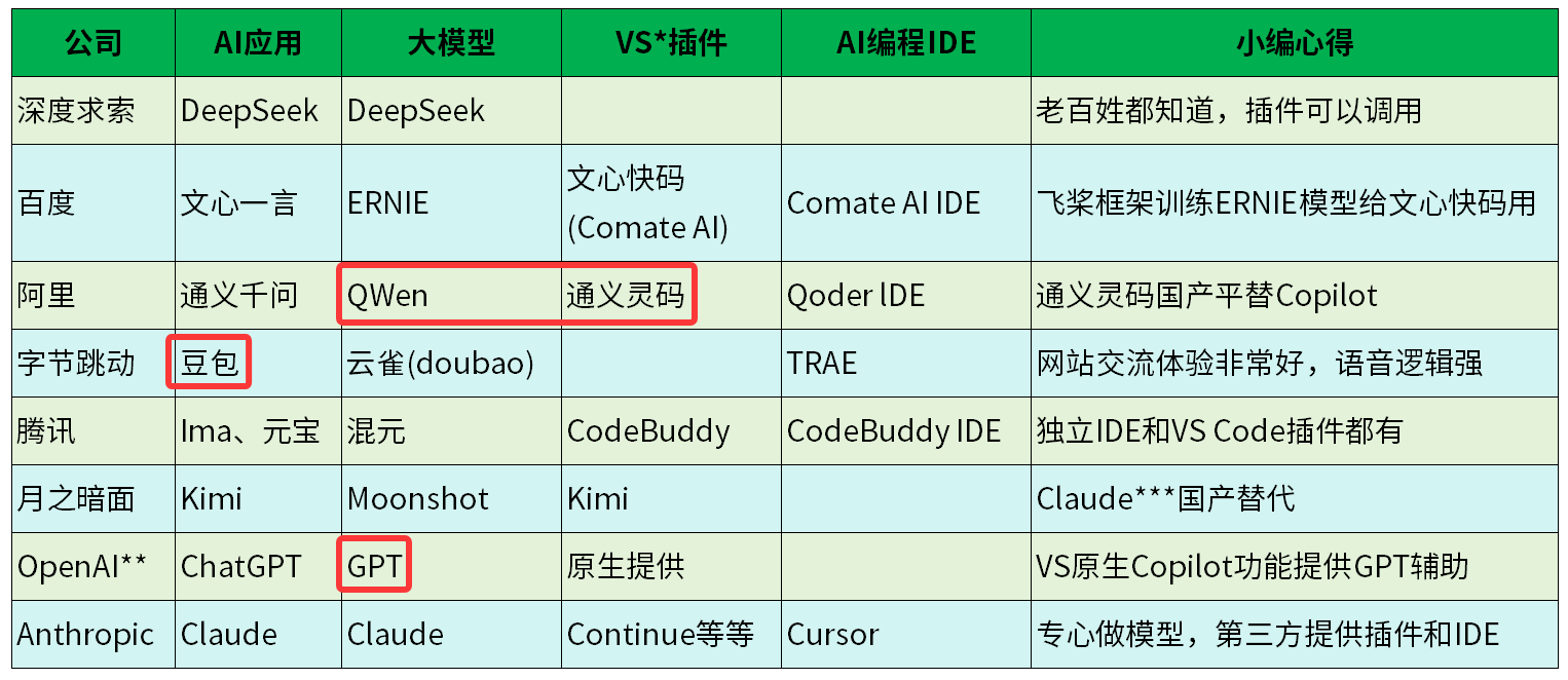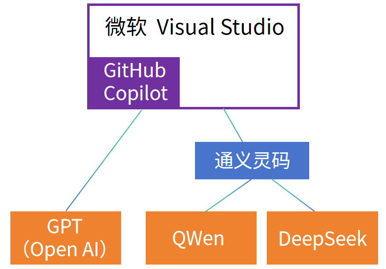 上图列举了一些研发AI技术的公司、他们的大模型、大模型基础上提供的网页AI应用、Visual Studio开发环境下的AI插件,以及这些公司提供的集成好AI功能的开发集成环境。这里列举的公司,除了引领生成式AI的OpenAI是微软参与发起的公司,其他都是中国公司。图中红色框选了几个项目,是编者使用并推荐的。当你有条件的时候,可以优选OpenAI GPT作为底层大模型。Visual Studio 2022起,原生具备的GitHub Copilot辅助编程模块就调用了GPT模型。当编者遇到网络困难的时候,通常会在Visual Studio下启用阿里的通义灵码插件。这个插件可以调用多种大模型。编者最常用千问(Qwen)模型。