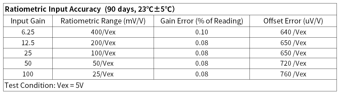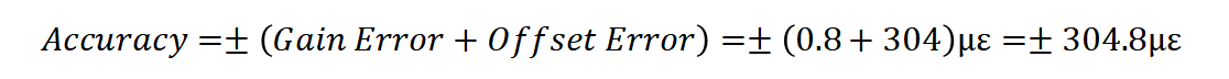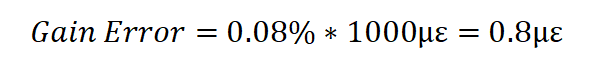 由表1-1精度表格可知,当Input Gain=x100时,增益误差为0.08%。理想应变值为1000 ,则计算结果为: