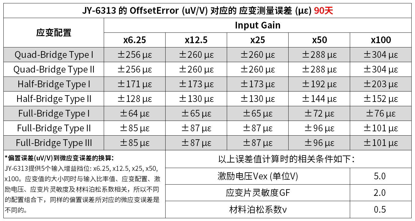 JY-6313的偏置误差以比率值表示,与输入增益Input Gain和激励电压Vex有关,以μV/V为单位。实际测量的应变量通常以με为单位,因此计算偏置误差时要将单位转换为με。