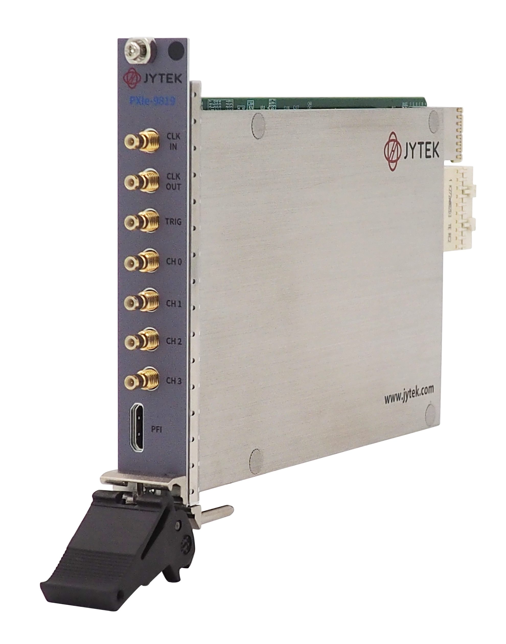 The JY-9819 PXI Express digitizer provides high speed, high quality data acquisition. Each of 4 input channels supports up to 250 MS/s sampling, with up to 16-bit resolution. This allows simultaneous recording of signals on all channels with no inter-channel phase delay. The extremely large onboard memory enables long recording times even at the highest sampling rates.
